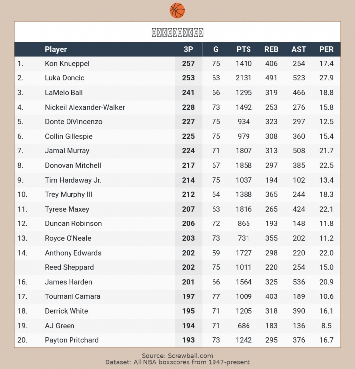 加上本场的6记三分,东契奇个人本赛季三分总数来到253记,联盟第二,距离联盟第一克尼佩尔(257记)仅差4记!